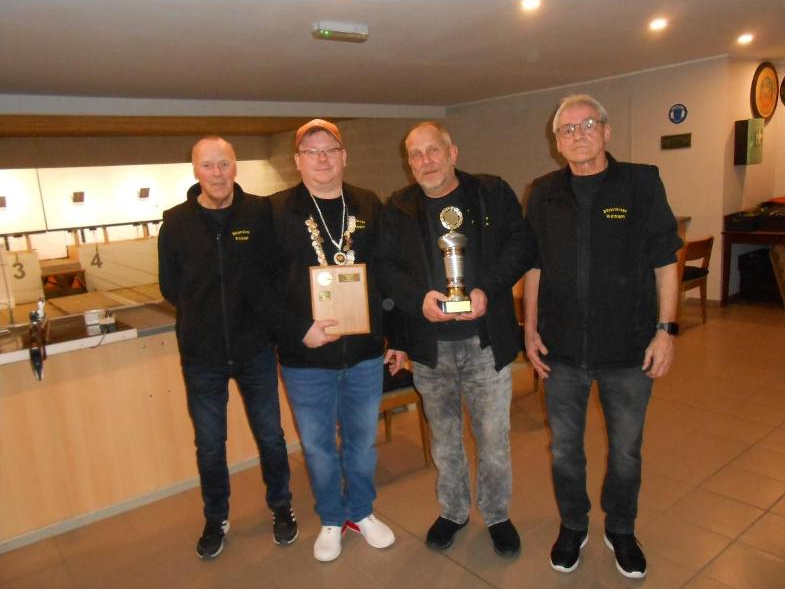 Von links: Oberst Horst Garms, Gewinner der Adolf-Stresing-Gedächtniskette und Jubiläumskette Patrick Lorenz, Gewinner des Jürgen Wittpennig-Pokal und Sieger beim Preisschießen Dirk Wiezke-Poeschel, Schießwart Peter Breese.