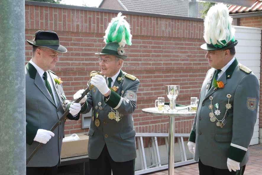 "In froher Kameradschaft nahmen die Mitglieder der 2.Kompanie der SG Wittingen zu Pfingsten am diesjährigen Schützenfest teil. Nach einem ereignisreichen Samstag, der harmonisch mit allen Mitgliedern der SG gefeiert wurde, nutzte die 2. Kompanie am Pfingstsonntag das alljährliche Kompaniefrühstück für die feierliche Durchführung einer seltenen Dienstobliegenheit: Nach mehr als einem Jahrzehnt erfolgreicher Dienstzeit übergab der Alt-Kompaniechef Oberleutnant Dr. Alfred Stein seine Dienstgeschäfte an den zuvor einstimmig neu gewählten Kompaniechef Leutnant Dr. Rolf Mahlke. Die feierliche Übergabe des Kompanieführer-Säbels erfolgte durch den altgedienten und bewährten Ehren-Kompaniechef Oberstleutnant Hinrich Tietjen, der im Namen der Kompaniemitglieder dem scheidenden Kompaniechef Dank und Anerkennung für seine langjährigen hervorragenden Dienste zum Wohle der SG Wittingen und der 2.Kompanie übermitteln konnte und dem neuen Kompaniechef Glück und eine "allzeit gute Hand" bei allen Dienstobliegenheiten wünschte. Die folgenden Stunden des Pfingstsonntag zeigten, dass die guten Wünsche des Ehren-Kompaniechefs sogleich in Erfüllung gingen, denn als erste Amtshandlung konnte der Leutnant Dr. Rolf Mahlke mit hervorragender musikalischer Umrahmung durch die "Fulauer" nach Vereidigung und dem "Sprung über den Säbel" ein neues Kompaniemitglied in die Reihen der 2.Kompanie aufnehmen.