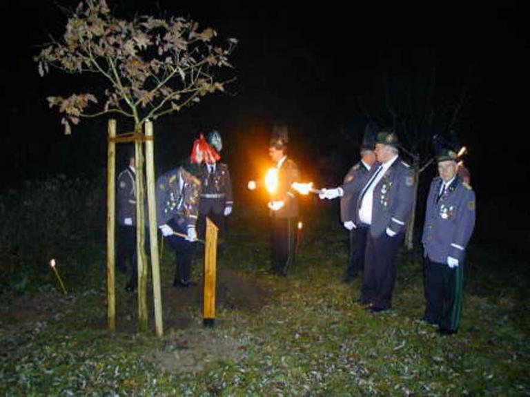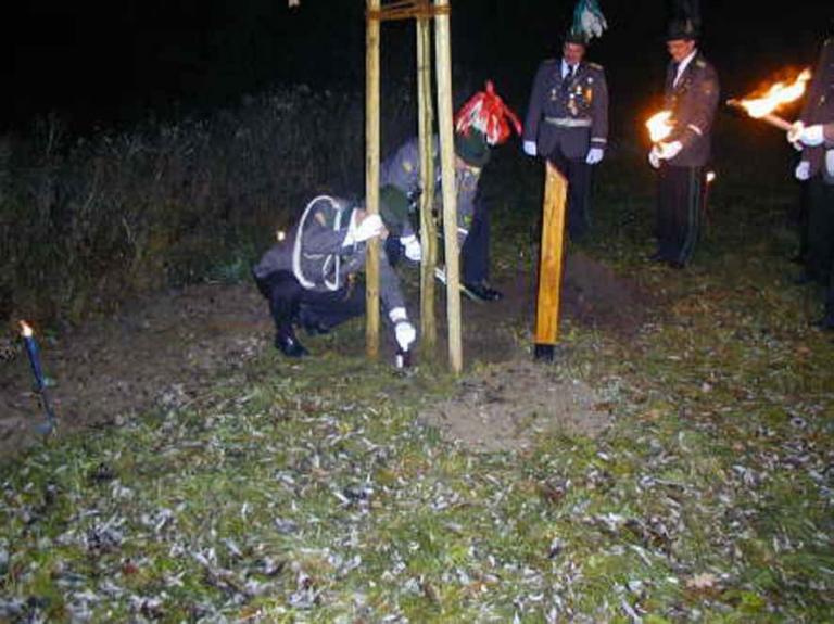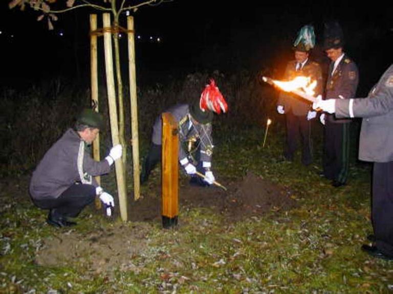 Aber seine Kompaniebrüder hatten sich etwas besonderes einfallen lassen. Pünktlich wurde vorm Schießhaus angetreten, einige Schützenbrüder waren mit Fackeln ausgerüstet. Diese sorgten dafür, das alle den rechten Weg zum Standort der Königseiche fanden. Um auch den Gleichschritt halten zu können, gab es echt zünftige Blasmusik, und zwar aus der Konserve. Der Standort der Eiche war ebenfalls mit Fackeln ausgeleuchtet, so dass im Eiltempo die Königseiche gepflanzt wurde.