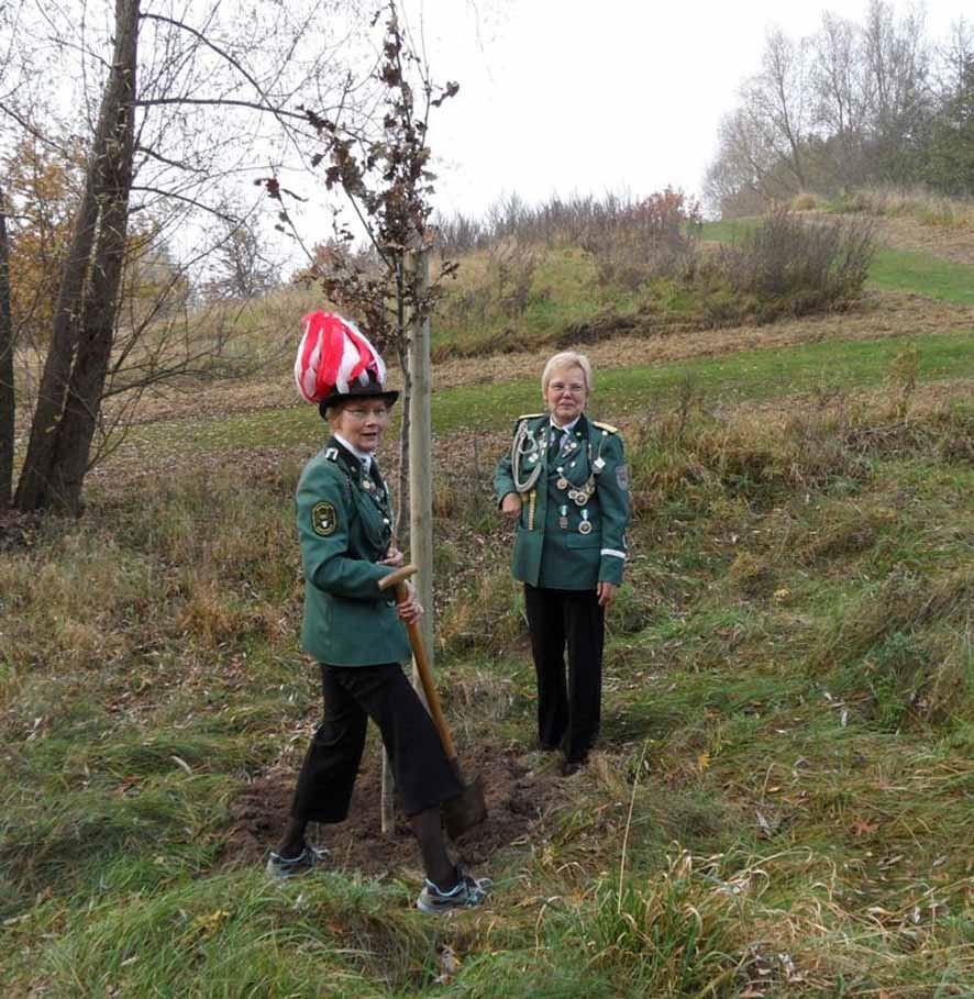 Königin Christa und Iris hatten schon alles gut zum pflanzen der Eiche vorbereitet. Somit konnte die Eiche dann auch ohne Umstände gepflanzt werden. Nachdem die Eiche gut angebunden und "angegossen" war, marschierte die Formation zurück zum Schießhaus. Dort wurde der Nachmittag bei guter Verpflegung und lustigen Gesprächen fröhlich beendet.