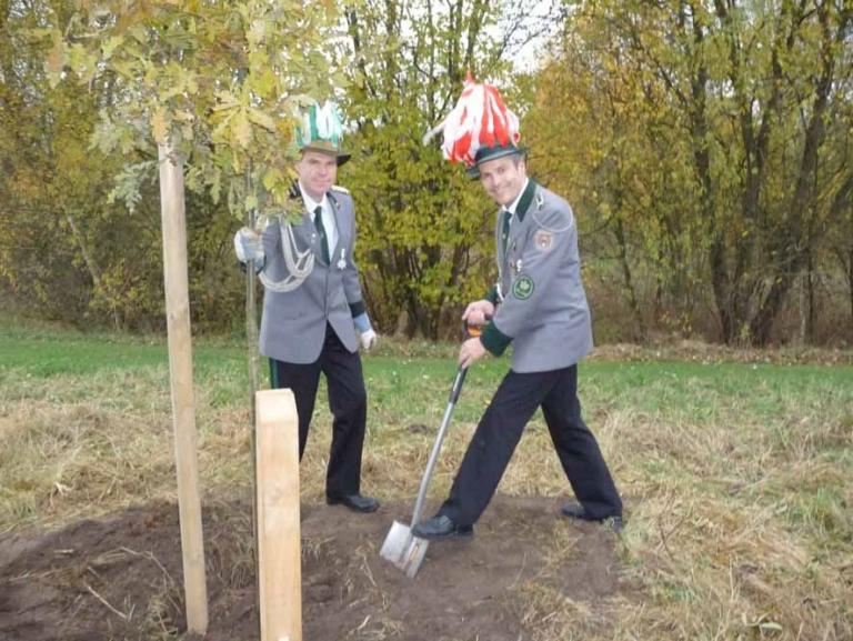 Die von Majestät Thorsten Meyer und Adjutant Klaus Dreblow angeführte Formation marschierte zur Pflanzstelle am Schönungsteich. Diese war schon gut vorbereitet, so dass die Eiche sofort gepflanzt werden konnte. Nach getaner Arbeit wurde die Eiche gut angebunden und angegossen. Dann ging es aber schnell in die Unterkunft, wo Ihre Majestät noch zu einem Umtrunk und Imbiss einlud. So wurde der Nachmittag bei guter Verpflegung und lustigen Gesprächen fröhlich beendet.
