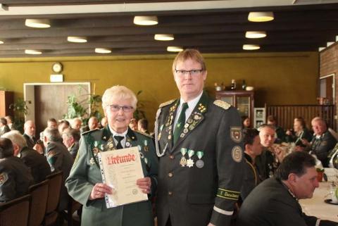 Zu Ehrenmitgliedern wurden Alfred Barnieske und Irmtraut Rosin. Nöhre-Chefin Edit Margowski bekam für die Bewirtung der Freunde aus Wiesen eine Ehrung. Abschlägig beschieden wurde der Antrag eines Mitglieds, die Jahresbeiträge der Jungschützen mit denen der jungen Schützen in den anderen Kompanien anzugleichen. „Die Jungschützen haben Extra-Kosten beim Königsessen und nicht alle Rechte der anderen Schützen“, setzte Schulze dagegen und sprach sich für die Beibehaltung der bisherigen Beitragsstruktur aus. Die Mitglieder folgten ihm fast einstimmig.