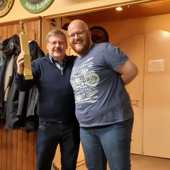 Kompanieführer Klaus Jübermann (l.) freut sich über den errungenen Mannschaftspokal, den Mirko "Erna" Kummert überreichte.