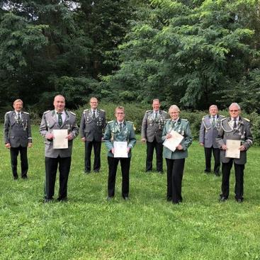 25 Jahre Mitglied: Karl-Heinz Breitmann (Bürgerkorps), Petra Breitmann (Damenkompanie), Daniela Jübermann (2. Damenkompanie), Rudolf Lüderitz (Bürgerkorps), Michael Sterz (6. Kompanie)