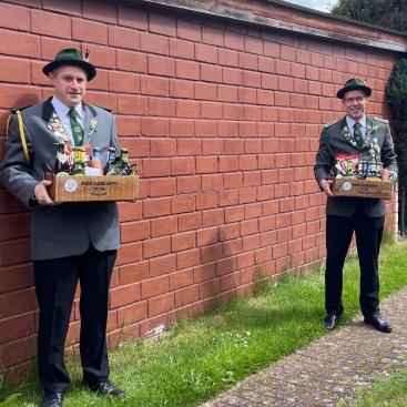 Dennis Tesch (v.l.) und Björn Jübermann überbrachten den Mitgliedern der 1. Jägerkompanie bunt gefüllte Pfingstkörbe mit Leckereien aus der Region.