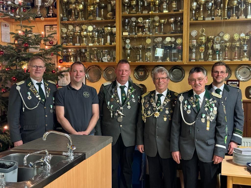 Der 1. Vorsitzende Uwe Schulze (v.l.) ehrte die Besten Schützen des Abends: Sven Jübermann, Jörg Berlin, Wolfgang Berlin, Hermann Cors und André Fröhlich.