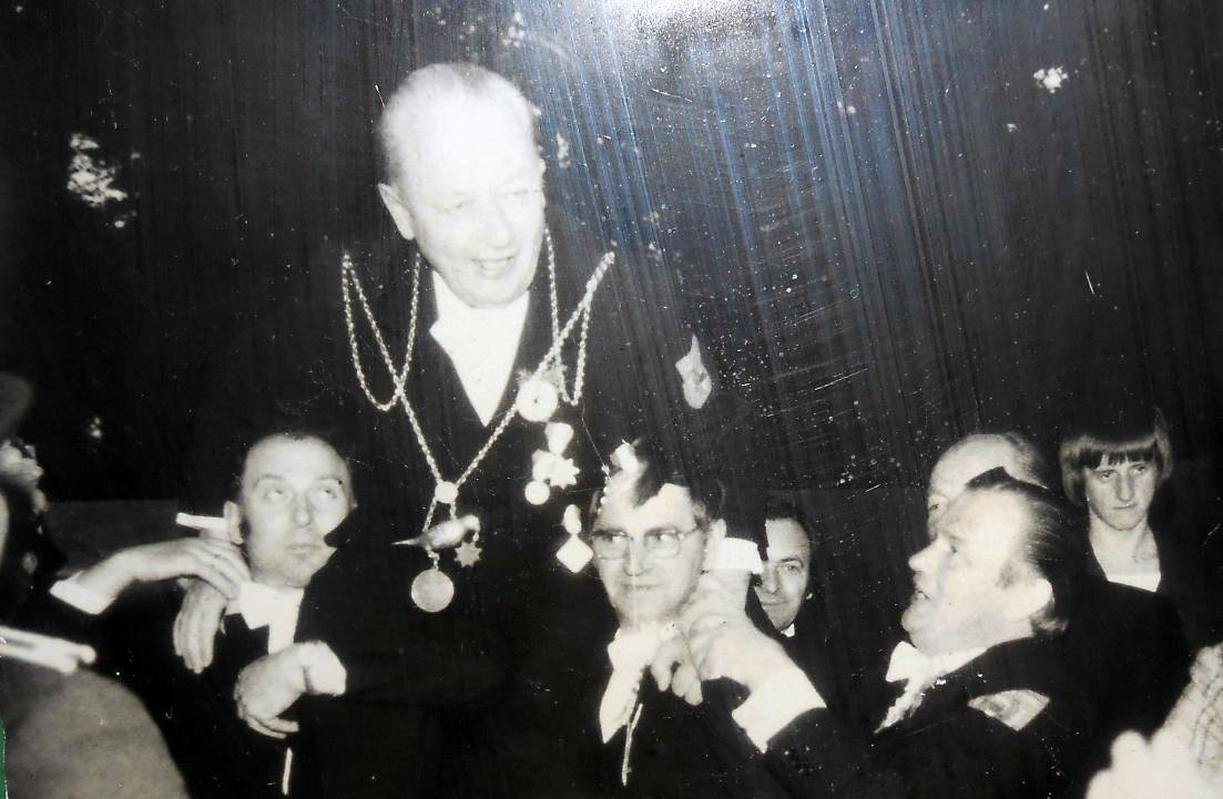Zur Proklamation gehörte auch die Bekanntgabe der Namen der Jungschaffer Ulrich Siemer, 2. Kompanie, und Günter Meyer, 3. Kompanie. Altschaffer wurden Heinrich Jordan, 7. Kompanie, und Karl Kamlah, Bürgerkorps. Ein herzliches Dankeschön erhielten auch die gewesenen Altschaffer H. Schillmann (4. Kp.) und G. Unger von der 6. Kompanie. Schließlich stellte sich der neue Adjutant des frischgebackenen Schützenkönigs vor. Es ist Friedel Haug, natürlich vom Bürgerkorps.
