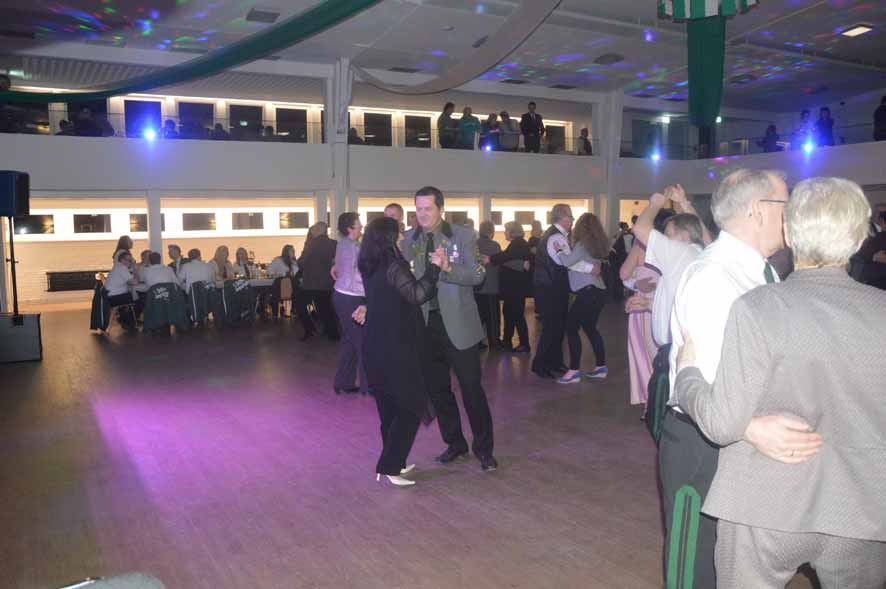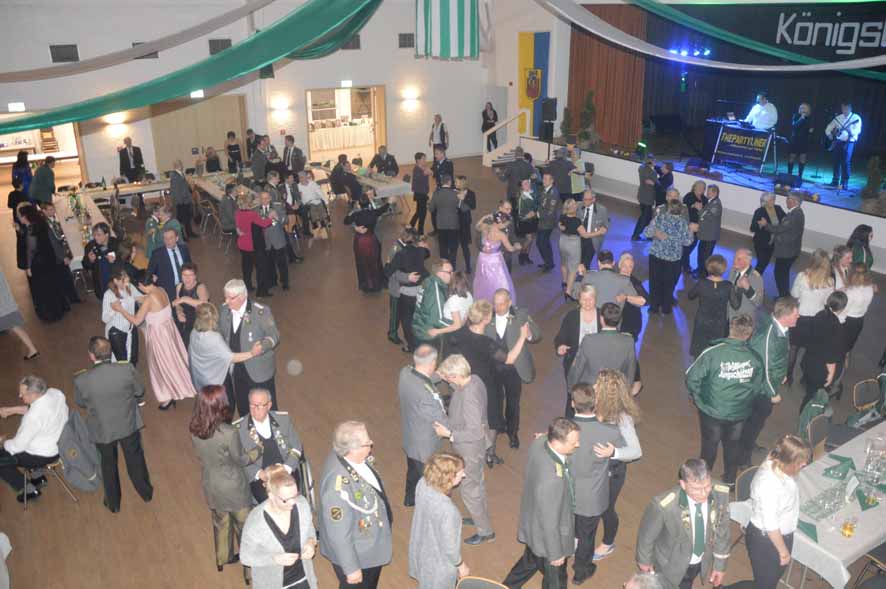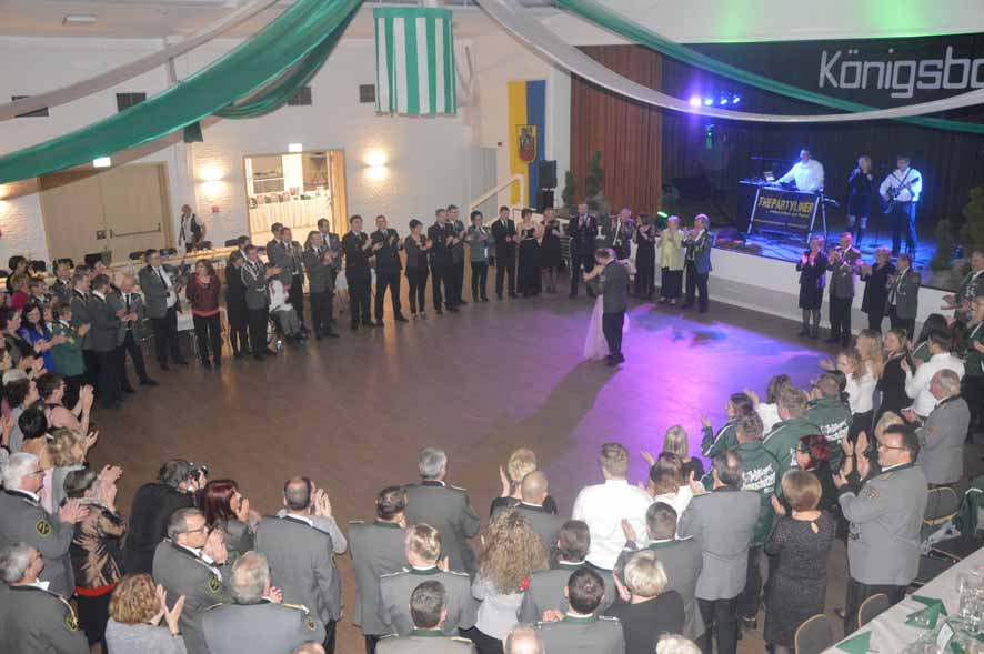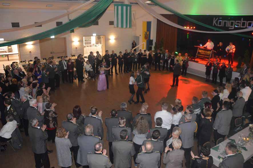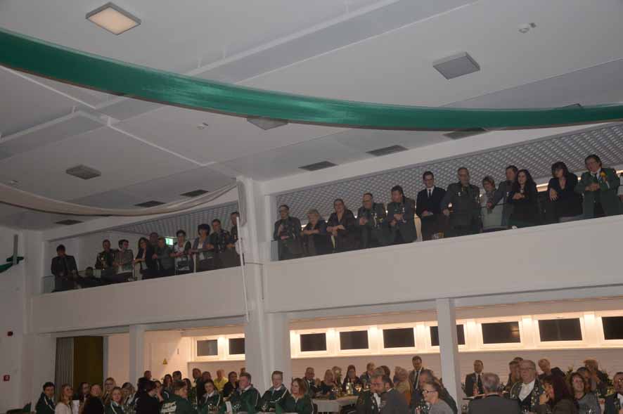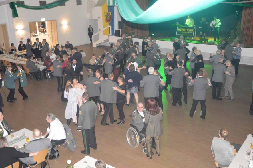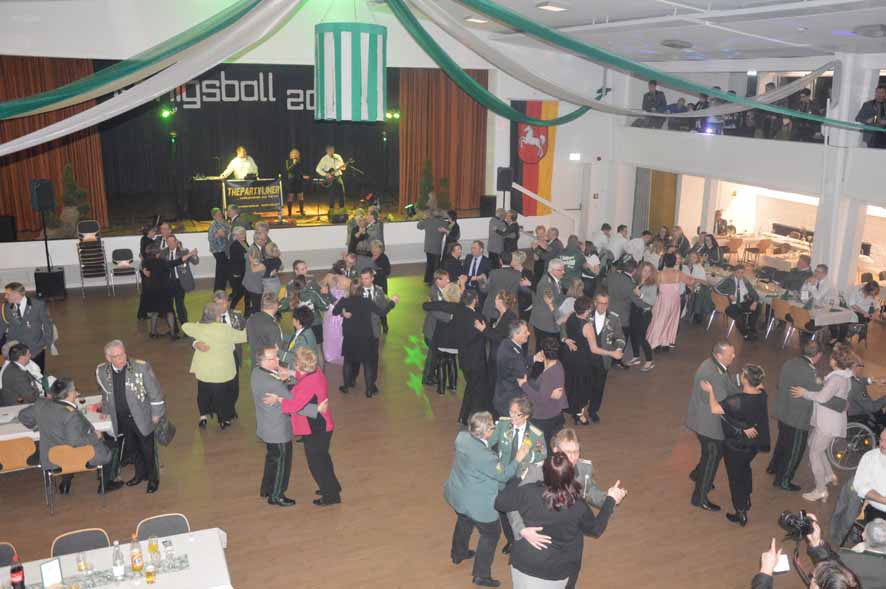 Beim opulenten Essen standen die Original Fulauer dem feiernden Volk musikalisch zur Seite. Nach den Ehrungen gab Seine Majestät Michael mit Königin Silke durch einen Ehrentanz den Startschuss für die anderen Gäste in der gut gefüllten Stadthalle. „Zwei Kompanien haben ihre Plätze auf den oberen Rängen, damit die Tanzfläche groß genug ist“, erklärte Schützenchef Uwe Schulze, der sich ausdrücklich bei den „Partyliners“ bedankte, die kurzfristig bei der Musik eingesprungen waren.