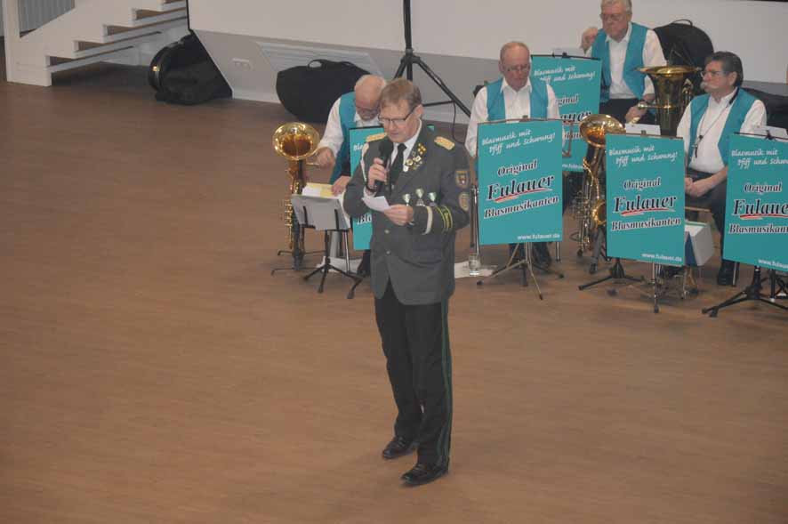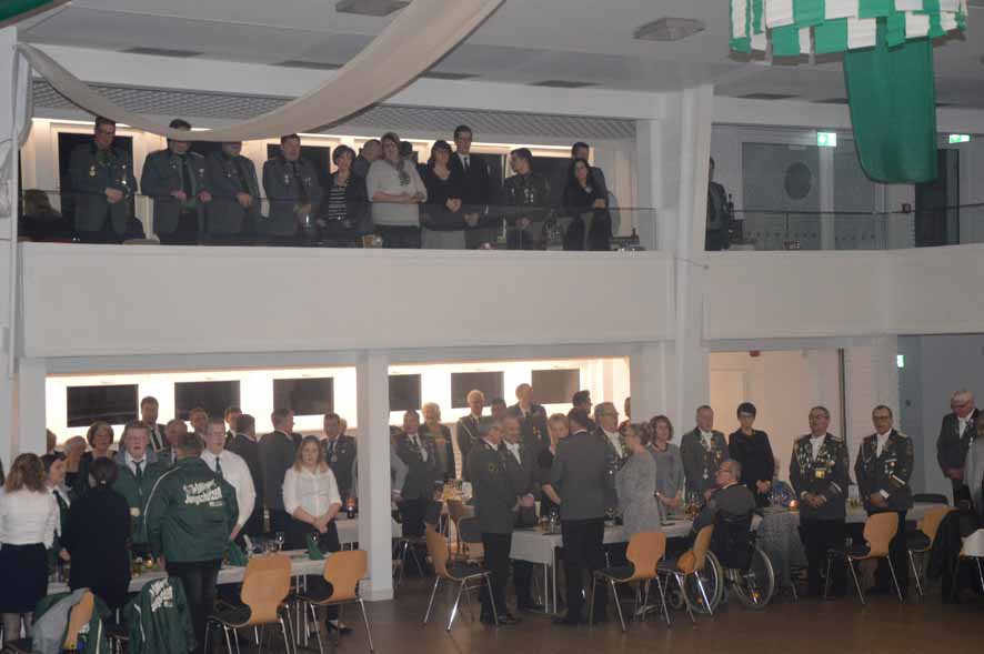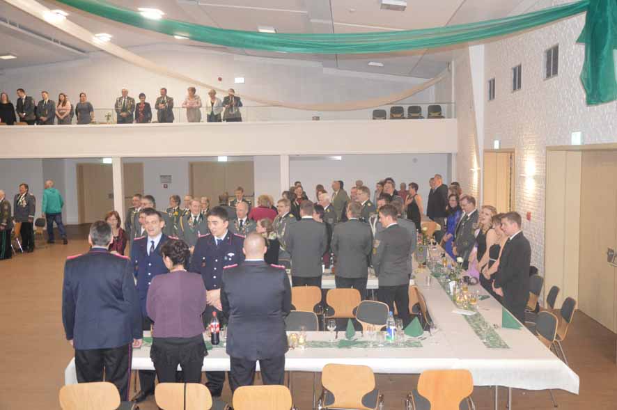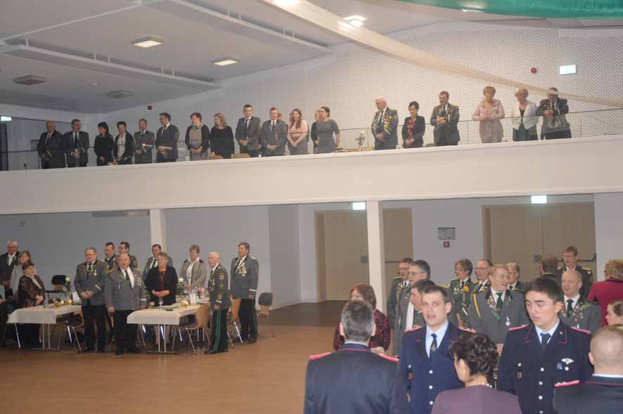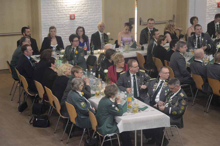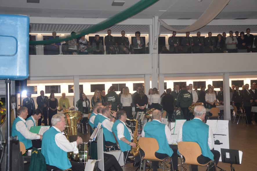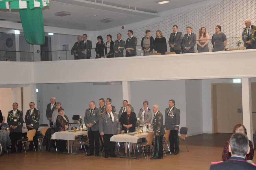 Beim opulenten Essen standen die Original Fulauer dem feiernden Volk musikalisch zur Seite. Nach den Ehrungen gab Seine Majestät Michael mit Königin Silke durch einen Ehrentanz den Startschuss für die anderen Gäste in der gut gefüllten Stadthalle. „Zwei Kompanien haben ihre Plätze auf den oberen Rängen, damit die Tanzfläche groß genug ist“, erklärte Schützenchef Uwe Schulze, der sich ausdrücklich bei den „Partyliners“ bedankte, die kurzfristig bei der Musik eingesprungen waren.
