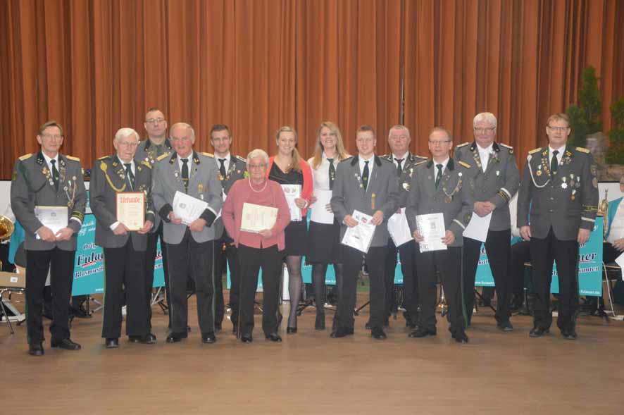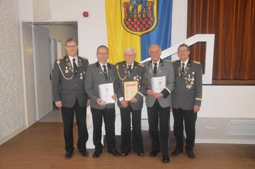 20 Jahre nach Jübermann trat Harald Fischer in den Verein ein. Er kann somit immerhin auch auf stattliche 50 Jahre im Schützenwesen (DSB und Verein) verweisen und wurde mit DSB-Urkunde, Orden und Goldkranz geehrt wurde. Für ihre 40-jährige Mitgliedschaft (DSB/Verein) ehrte die Versammlung Carsten Nordmann und Ernst Knust. Ulrich Burmeister (25 Jahre DSB), Michael tresing (25 Jahre DSB und Verein), Georg Pawlicki (15 Jahre NSSV) und Denis Jaworski, Denise Schulze, Anna-Vanessa Pörschke, Jan Eimecke, Jens Heitmann, Thorben Hildebrandt, Raphael Dreyer und Nils Eimecke (alle 15 Jahre NSSV/Verein) wurden ebenfalls ausgezeichnet.