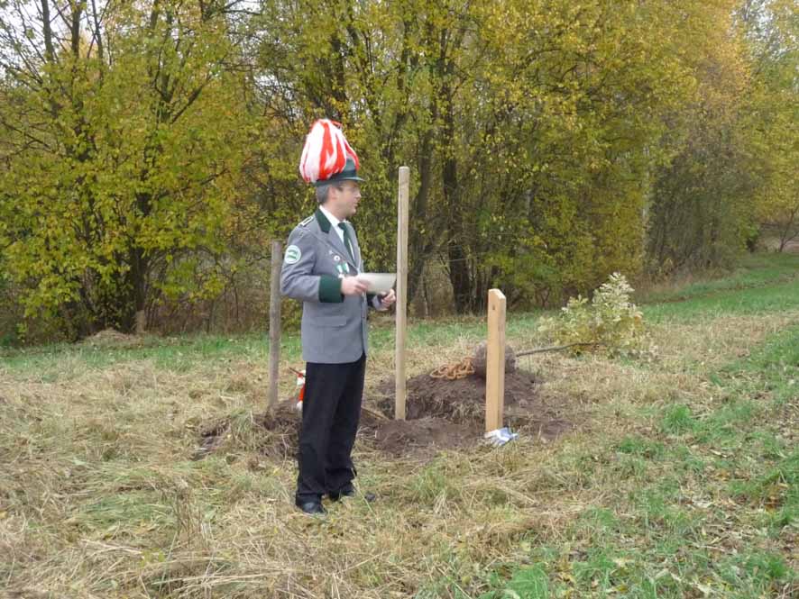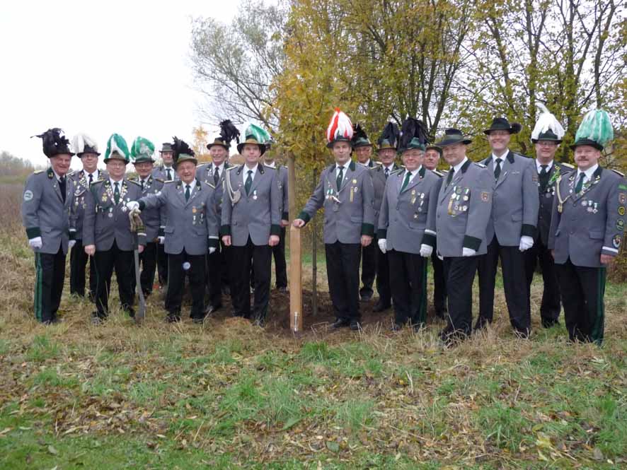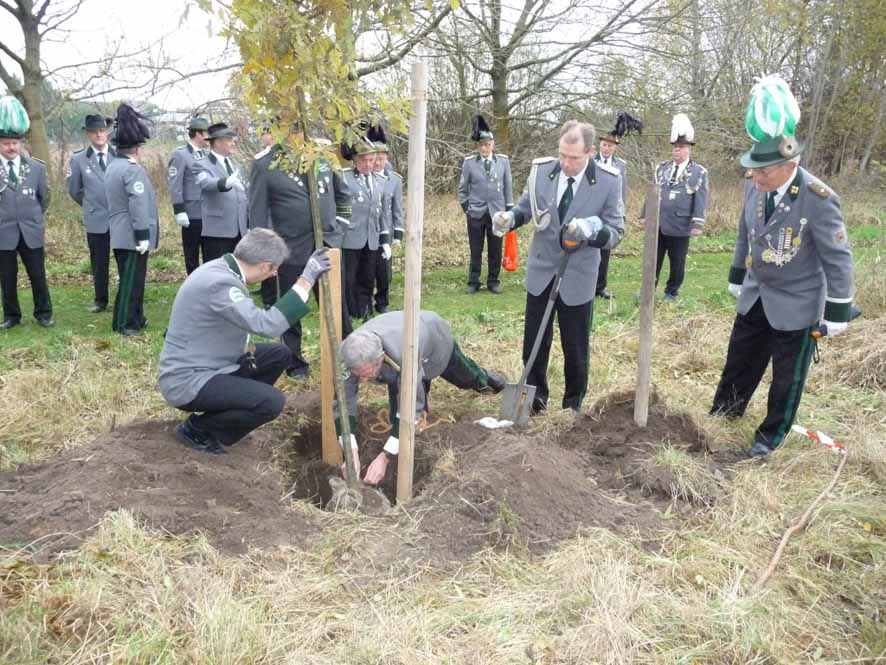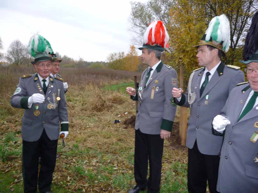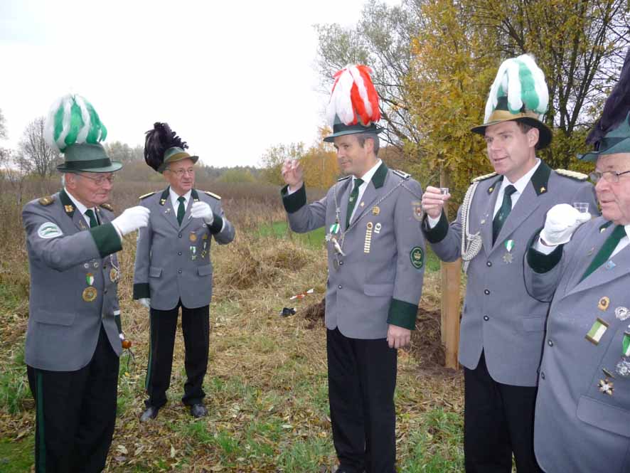 Die von Majestät Thorsten Meyer und Adjutant Klaus Dreblow angeführte Formation marschierte zur Pflanzstelle am Schönungsteich. Diese war schon gut vorbereitet, so dass die Eiche sofort gepflanzt werden konnte. Nach getaner Arbeit wurde die Eiche gut angebunden und angegossen. Dann ging es aber schnell in die Unterkunft, wo Ihre Majestät noch zu einem Umtrunk und Imbiss einlud. So wurde der Nachmittag bei guter Verpflegung und lustigen Gesprächen fröhlich beendet.