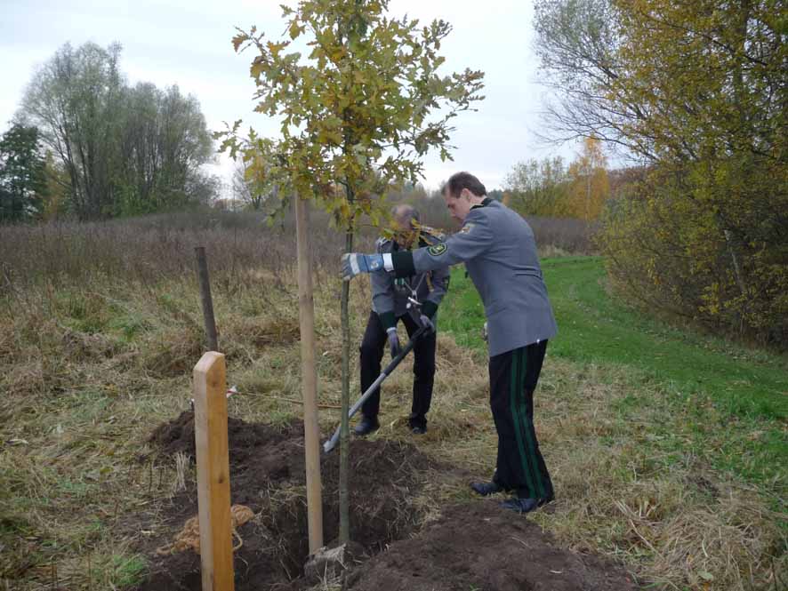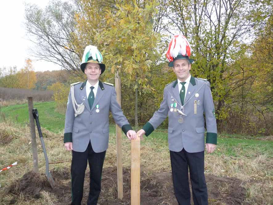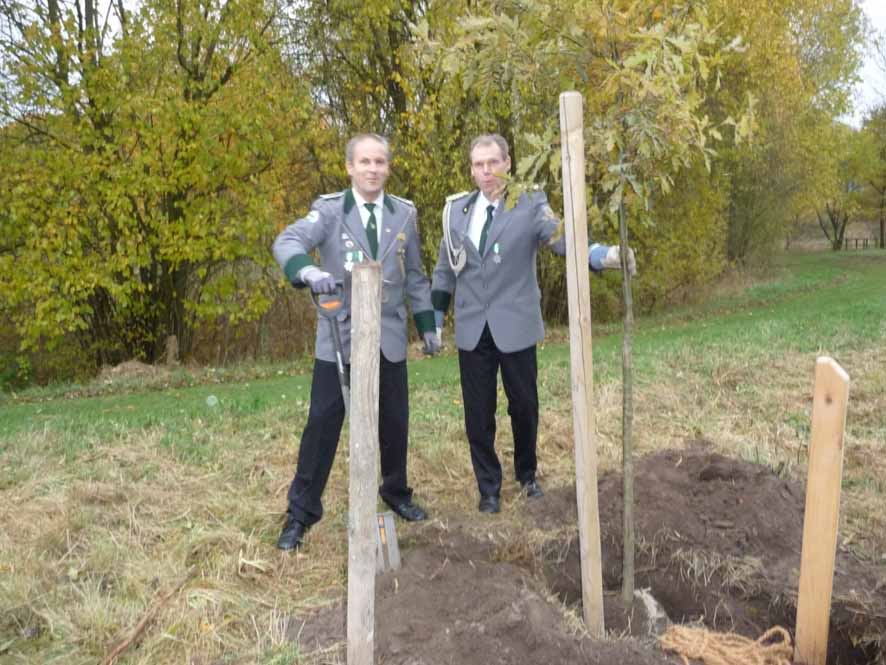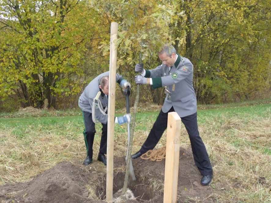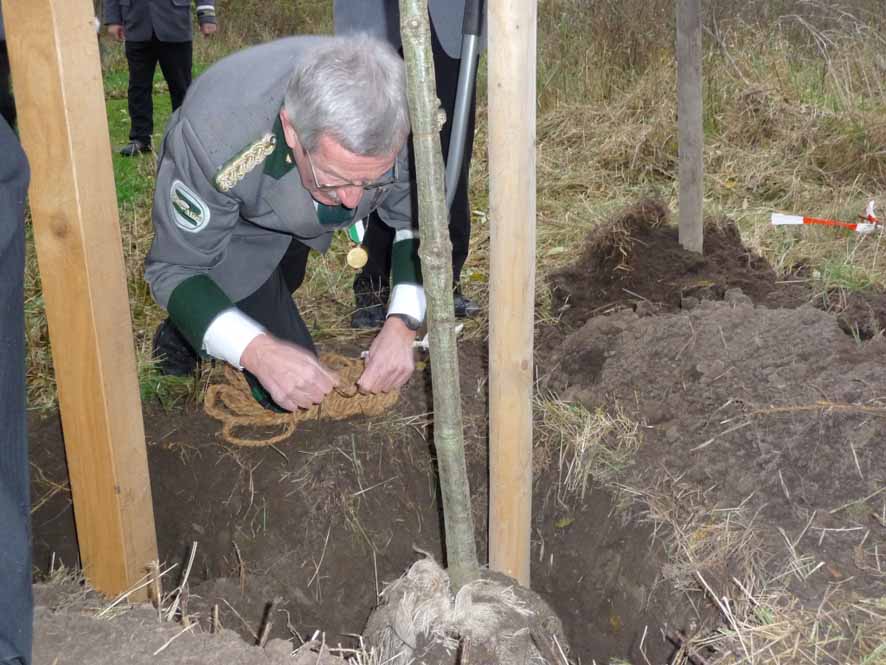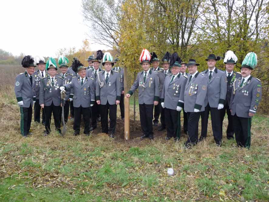 Die von Majestät Thorsten Meyer und Adjutant Klaus Dreblow angeführte Formation marschierte zur Pflanzstelle am Schönungsteich. Diese war schon gut vorbereitet, so dass die Eiche sofort gepflanzt werden konnte. Nach getaner Arbeit wurde die Eiche gut angebunden und angegossen. Dann ging es aber schnell in die Unterkunft, wo Ihre Majestät noch zu einem Umtrunk und Imbiss einlud. So wurde der Nachmittag bei guter Verpflegung und lustigen Gesprächen fröhlich beendet.